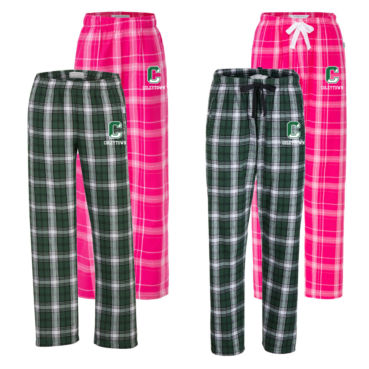 Flannel PJ Pants with Coleytown Block C logo printed on the left leg. Youth sizes are Polyester Flannel, Adult sizes are cotton flannel. Youth pants are CPSC certified for youth sleepwear. Pink Carnegie Plaid color is only available in Youth and Ladies sizes.