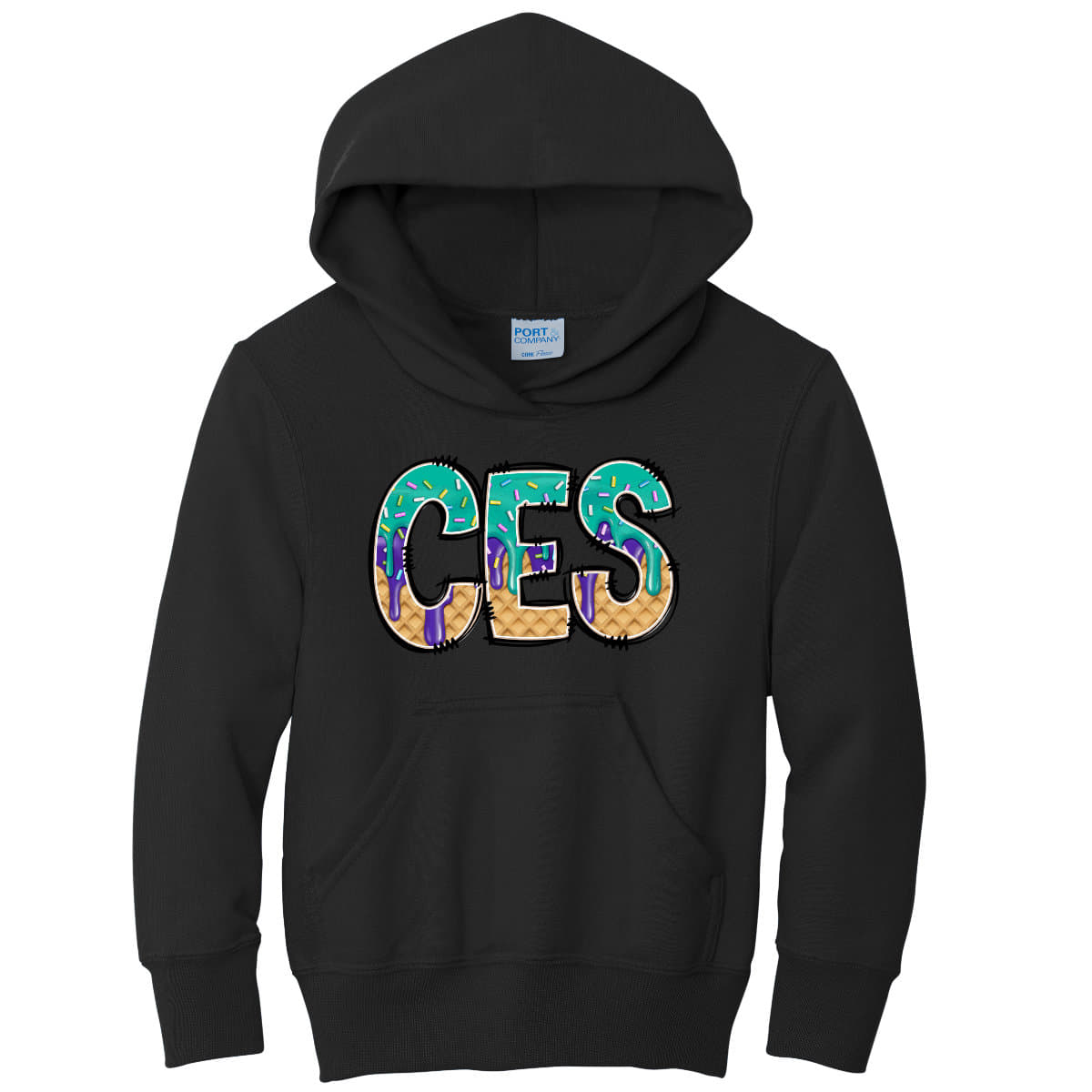 Lightweight Hooded sweatshirt with Drippy Ice Cream CES logo printed on the front. Size chart available below.